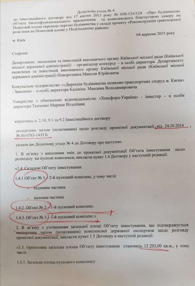 Дополнение к инвестиционному договору №050-13/і/124 было подписано тремя сторонами: директором ООО “Хенсфорд-Украина” Мариной Ткаченко, директором КП Владимиром Кислициным и директором Департамент экономики и инвестиций Киевской горгосадминистрации (КГГА) Николаем Поворозником, который ныне является первым заместителем главы КГГА Виталия Кличко.