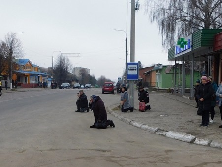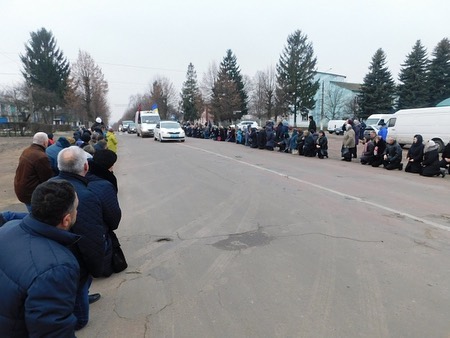 На маршруте, по которому ехал кортеж с телом погибшего бойца, люди стояли на коленях. Более двухсот жителей села встретили украинского героя в райцентре, склонив головы.