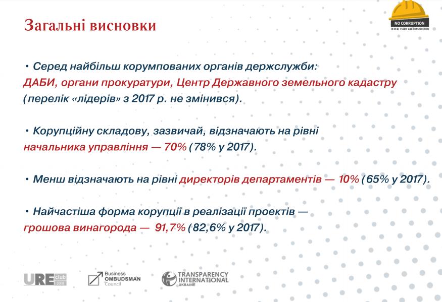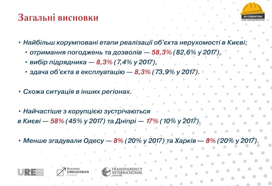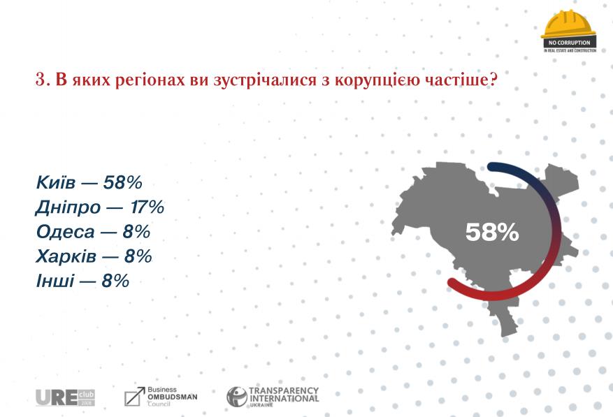 Украинский клуб недвижимости (URE Club), позиционирующий себя как бизнес-ассоциацию экспертов и практиков рынка недвижимости, приводит свои цифры по коррупции в строительной отрасли. Так, согласно анонимному опросу среди застройщиков и участников ассоциации, с проявлением коррупции чаще всего приходится сталкиваться при получении согласований и разрешений от органов контроля (58,3% в Киеве, 42% - в регионах).