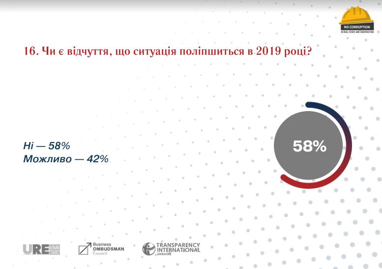 В опросе среди игроков строительного рынка, который проводился весной этого года, последним был вопрос о возможности преодоления коррупции в сфере недвижимости. На тот момент, когда все понимали, что грядет смена политического режима, 42% из опрошенных выразили в своих ответах надежды на лучшее.