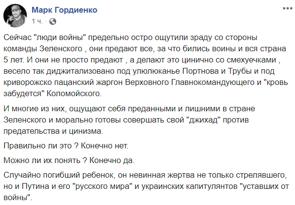 "Сейчас "люди войны" предельно остро ощутили зраду со стороны команды Зеленского , они предают все, за что бились воины и вся страна 5 лет. И они не просто предают , а делают это цинично со смехуечками , весело так диджитализовано под улюлюканье Портнова и Трубы и под криворожско пацанский жаргон Верховного Главнокомандующего и "кровь забудется" Коломойского.