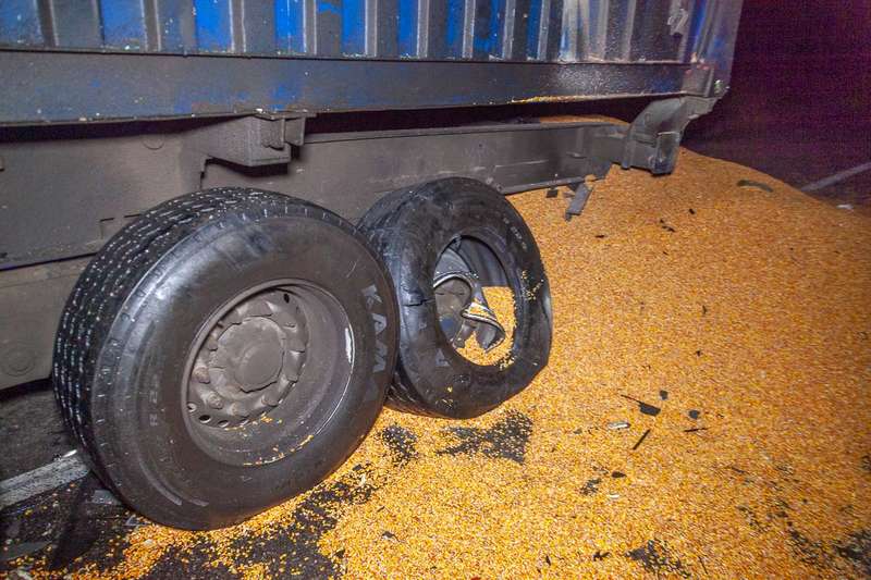 Предположительно, участников аварии было двое. Вдоль дороги, возле барьерного ограждения, можно заметить колею. Вполне возможно, что два грузовика "притерлись" во время движения. У второй фуры повреждены колеса и рассыпалась кукуруза.