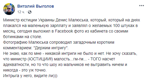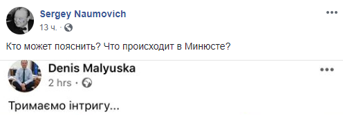 Министр юстиции Денис Малюська вчера, 16 декабря, озадачил пользователей Facebook странным постом.