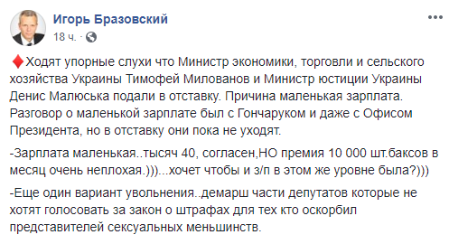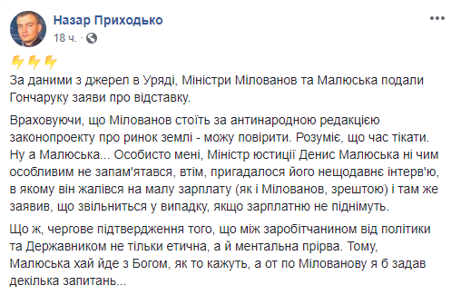 По некоторым данным, министры Милованов и Малюська даже подали премьер-министру Гончаруку заявления об отставке.