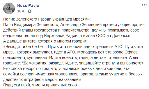 Гражданский активист Павел Нусс акцентировал свое внимание на части интервью, где Александр Зеленский назвал выступающих против политики президента мразями и отправил их в ООС.