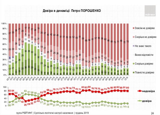 В то же время, согласно опросу, рейтинг экс-президента Петра Порошенко стремительно падает. По состоянию на декабрь, у пятого президента низкий уровень доверия граждан. Ему доверяют лишь 13% респондентов и не доверяют 80%.