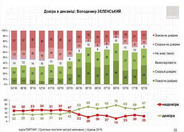 Возглавляет рейтинг доверия украинцев Зеленский. Ему доверяют 67% опрошенных и 25% не выразили доверия.