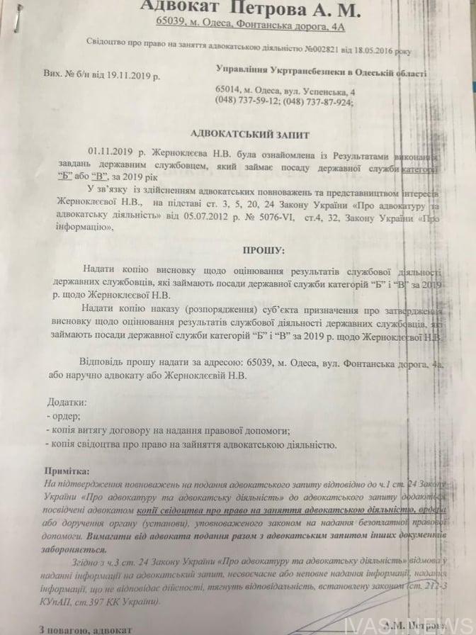 Пока следственные органы рассматривают заявления Натальи Жерноклеевой ее оппоненты продолжают давить на руководство «Укртрансбезопасности» с требованием назначить «нужных» им людей. С июля текущего года пять человек пытались исполнять обязанности начальника регионального управления, не выдерживают и уходят. Наталья Жерноклеева с 12 декабря под давлением новых писем в Киев на время очередной проверки ее работы отстранена от занимаемой должности. Что будет дальше с управлением, кто будет там работать, остается большим вопросом. Примечательно, что общественная организация, которая с апреля текущего месяца кошмарит Наталью Жерноклееву, засветилась во многих уголовных эпизодах. На их счету многочисленные беспорядки в Апелляционном хозяйственном суде области, где в 2016 г. решался вопрос о принадлежности земли в Фонтанке. В 2017 г. участники «Украины — это мы» попытались захватить помещение в Одессе, расположенное на ул. Литературной. Один из вооруженных «активистов» забаррикадировался в здании и угрожал людям огнестрельным оружием. Было начато уголовное производство по части 4 ст. 296 — хулиганство с применением огнестрельного оружия. Однако никто не понес ответственности. 27 мая 2017 г. в Затоке вооруженные люди ворвались в полицейский участок и захватили помещение местного поселкового совета. Это были «активисты» Голодка. В июле 2017 г. бойцы Голодка проводят захват здания Ширяевского районного суда с требованием уволить неугодного им судью. Интересна биография не только общественной организации, но самого Виталия Голодка. В 2005 г. сотрудник управления внутренней безопасности Отдела по борьбе с незаконным оборотом наркотиков в Одесской области, фигурировал в резонансных историях, связанных с покровительством наркоторговле и выбиванием показаний из подозреваемых и похищением людей. Но Голодок и его подельники каждый раз выходили «сухими из воды». Не нашли правоохранители и состава преступления и по многочисленным «актам хулиганства» уже общественника Виталия Голодка и его организации «Украина – это мы» Поэтому опасения за жизнь и здоровье новой жертвы Виталия Голодка – Натальи Жерноклеевой вполне обоснованы.