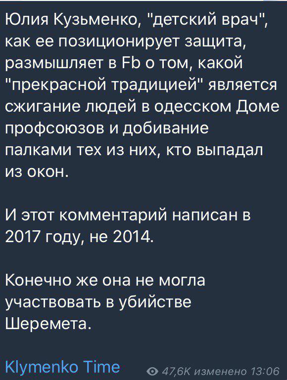 Подозреваемая в убийстве журналиста Павла Шеремета Юлия Кузьменко, которую суд сегодня решил оставить под арестом, называла поджог одесского Дома профсоюзов весной 2014 года “прекрасной майской традицией”.