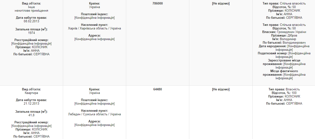 У декларації за минулий рік кандидата на посаду, поданій у серпні, зазначено, що з нерухомості у Колісник є нежитлове приміщення у Харкові на 1974 “квадратів” вартістю 786 тисяч гривень та квартира у Лебедині Сумської області на 41,8 “квадратів” вартістю 64 480 гривень.