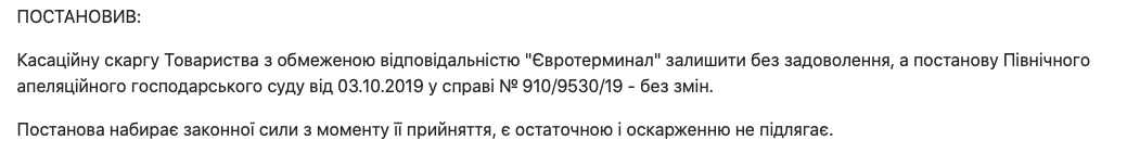 Антимонопольный комитет в конце 2018 года принимает решение: “Освободить проезд в порт”, оштрафовал монополиста на 5 млн. грн. (6-ти дневный обычный заработок у шлагбаумщика), в апреле 2019-года АМКУ предписал Одесскому исполкому открыть бесплатные ворота порта и … Дальнейшие разбирательства погрязли в судах… Причем, владельцам “Евротерминала” не представляет особых проблем, “поднимая” под миллиону гривен в день только на шлагбауме, вовлечь в судебные разбирательства с Антимонопольным комитетом все возможные суды. Дело было и в Админ суде (№640/7068/19), параллельно в Хоз.суде (№910/9530/19). В последнем 26-го ноября 2019 года суд постановляет: