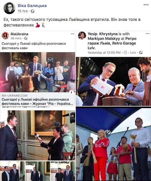 «Эх, такого светского тусовщика Льовщина потеряла. Он знал толк в «фестивалиниях», — иронизирует в Facebook львовская журналистка Вика Балицкая, подкрепляя пост фото с Мальским на открытии «фестиваля кавы», в ретро-гараже, Дворце Потоцких и на сцене со снопиком сена на одном из сельских праздников.