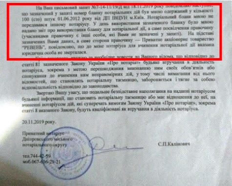 Натомість, такий нотаріальний бланк отримав сім років тому дніпровський нотаріус Сергій Калінович. Утім, Калінович теж запевняє, що використав цей бланк для зовсім іншого правочину з іншими сторонами.