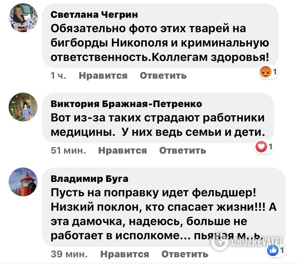 "Бессовестные, понапиваются, совсем нас за людей не считают!", "Интересно, оно уже проспалось?", "Обязательно фото этих тварей на бигборды Никополя и криминальную ответственность", "Вот из-за таких страдают работники медицины. У них ведь семьи и дети", – пишут пользователи.