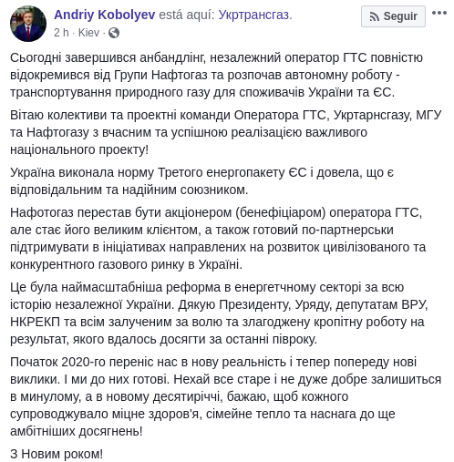Об этом в среду, 1 января, сообщил глава "Нафтогаза" Андрей Коболев на своей странице в Facebook.