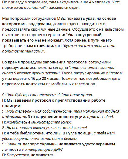 Ведущий канала "Русский ориенталист" Игорь Димитриев, который долгое время жил в Донецке, также пишет о задержании полицией "ДНР" людей в праздники из-за отсутствия "республиканского паспорта" для идентификации - мол, украинский уже не признается документом удостоверяющим личность.