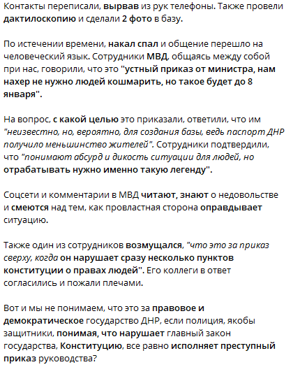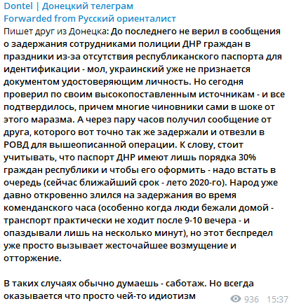 "...проверил по своим высокопоставленным источникам - и все подтвердилось, причем многие чиновники сами в шоке от этого маразма. А через пару часов получил сообщение от друга, которого вот точно так же задержали и отвезли в РОВД для вышеописанной операции. К слову, стоит учитывать, что паспорт "ДНР" имеют лишь порядка 30% граждан республики и чтобы его оформить - надо встать в очередь (сейчас ближайший срок - лето 2020-го). Народ уже давно откровенно злился на задержания во время комендантского часа (особенно когда люди бежали домой - транспорт практически не ходит после 9-10 вечера - и опаздывали лишь на несколько минут), но этот беспредел уже просто вызывает жесточайшее возмущение и отторжение. В таких случаях обычно думаешь - саботаж. Но всегда оказывается что просто чей-то идиотизм", - пишет "Русский ориенталист".