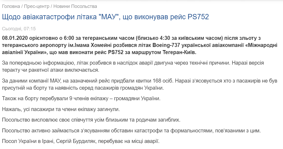В посольстве Украины в Иране сделали заявление касательно авиакатастрофы украинского самолета МАУ, разбившегося сегодня ночью в Тегеране.