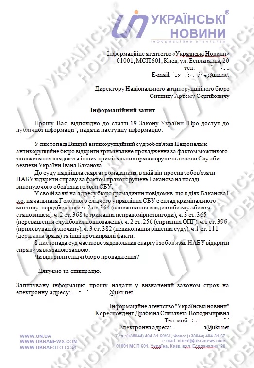 Ранее в суд поступила жалоба от гражданина, который сообщил, что в действиях Баканова и и.о. начальника Главного следственного управления СБУ содержится состав уголовного преступления, предусмотренного ч. 2 ст. 364 (злоупотребление властью или служебным положением), ч. 2 ст. 368 (получение неправомерной выгоды), ч. 3 ст. 365 (превышение служебных полномочий), ч. 2 ст. 256 (содействие ОПГ), ч. 1 ст. 396 (сокрытие преступления), ч. 3 ст. 382 (невыполнение решения суда), ч. 1 ст. 111 (государственная измена) и другие противоправные факты.