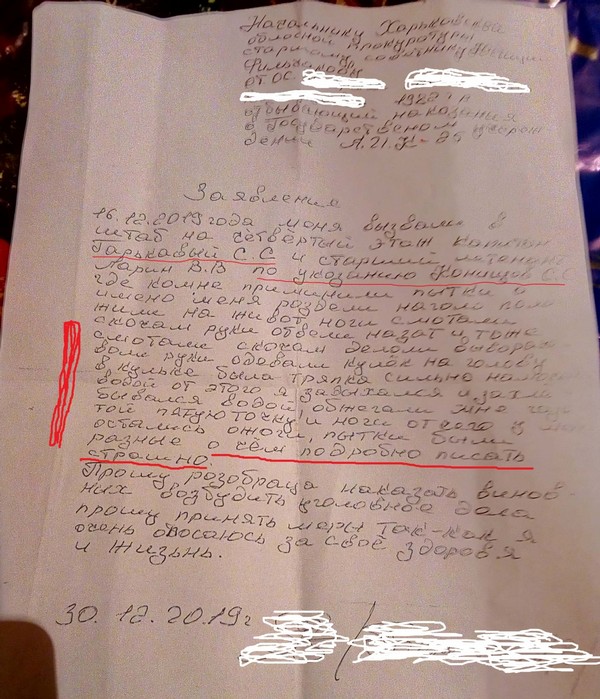В распоряжении «ОРД» оказалась копия одного из обращений, сделанных осужденными 30 декабря (см. фото ниже), в котором фигурирует та же фамилия организатора пыток – Конищев. Полковник Сергей Конищев – это первый заместитель начальника учреждения — заместитель начальника учреждения по надзору и безопасности, охраны и оперативной работы. Как рассказали «ОРД» пострадавшие, все пытки происходили по указанию именно этого человека. А главным палачом и исполнителем является Станислав Гарькавый (который действует руками т.н «помощников администрации»). Эти фамилии фигурирует во всех жалобах осужденных. А так же они фигурируют в заявлениях правозащитников. На основании полученных фактов, задокументированных мониторами «ХПГ», было направлено обращение в Генпрокуратуру и ГБР. И, как считают в «Харьковской правозащитной группе» — именно поднимающийся шум стал причиной «чрезвычайного положения» (подробнее).