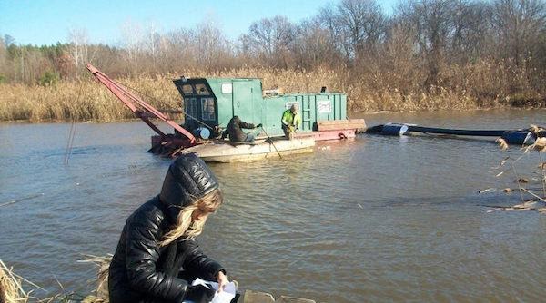 На этой фотографии видно, как земснаряд срезает природный берег реки Коломак, искусственно увеличивая ее “русло” вдвое