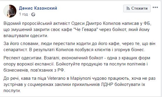 «Респект одесситам. Экономический бойкот — одна из лучших форм сопротивления вражеской экспансии. Бойкотируйте продукцию и услуги политиков и бизнесменов, связанных с Россией», — пишет журналист Денис Казанский.