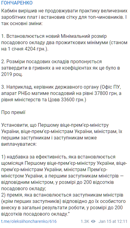 После того, как обнародовали зарплаты министров и стало известно, кто и сколько денег получил за декабрь 2019, во время заседания Кабинета министров было решено отказаться от практики установления больших заработных плат, а размер выплат чиновников утвердить в гривне, а не к коэффициенту.