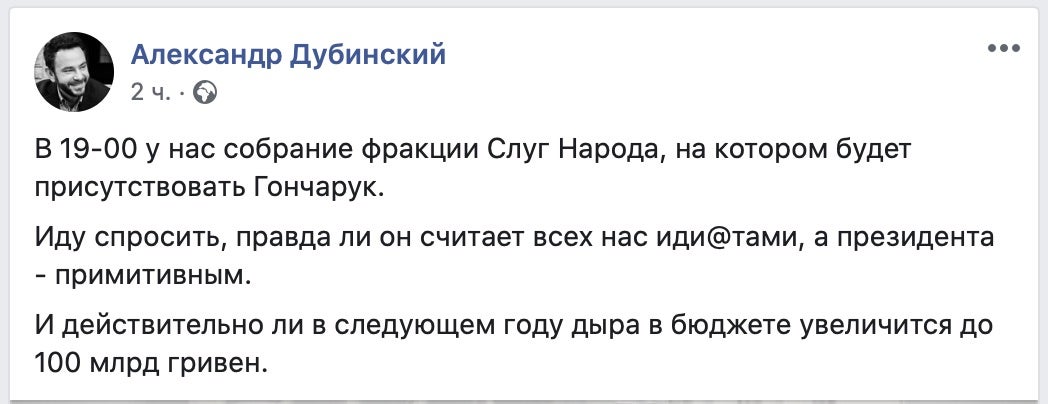 «В сети гуляет какая-то запись разговора с голосом якобы Гончарука, который говорит: «У президента примитивное понимание экономики». Депутаты из-за этого возмущаются, некоторые употребляют по этому поводу нецензурную лексику. Избранники, вроде, Бужанского и Дубинского даже подстрекают коллег выразить недоверие премьеру. Вместе с тем источники утверждают, что большинство фракции не готово идти на открытую конфронтацию с Гончаруком», — говорится в сообщении.