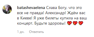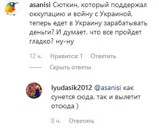 «Сюткин, который поддержал оккупацию и войну с Украиной, теперь едет в Украину зарабатывать деньги? И думает, что все пройдет гладко? Ну-ну», «Сунется сюда, так и вылетит отсюда», «Александр! Ждём вас в Киеве! Я уже билеты купила на ваш концерт. Будьте здоровы!» — писали фолловеры.