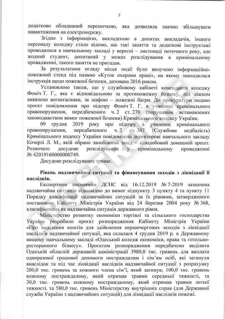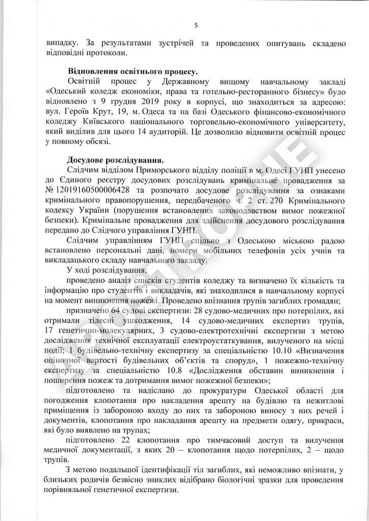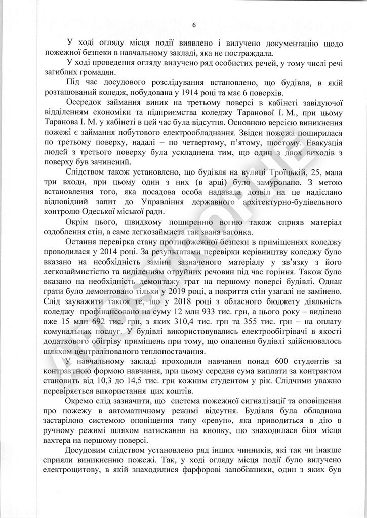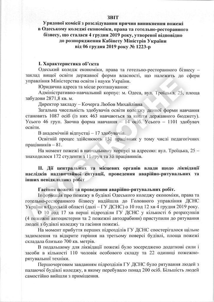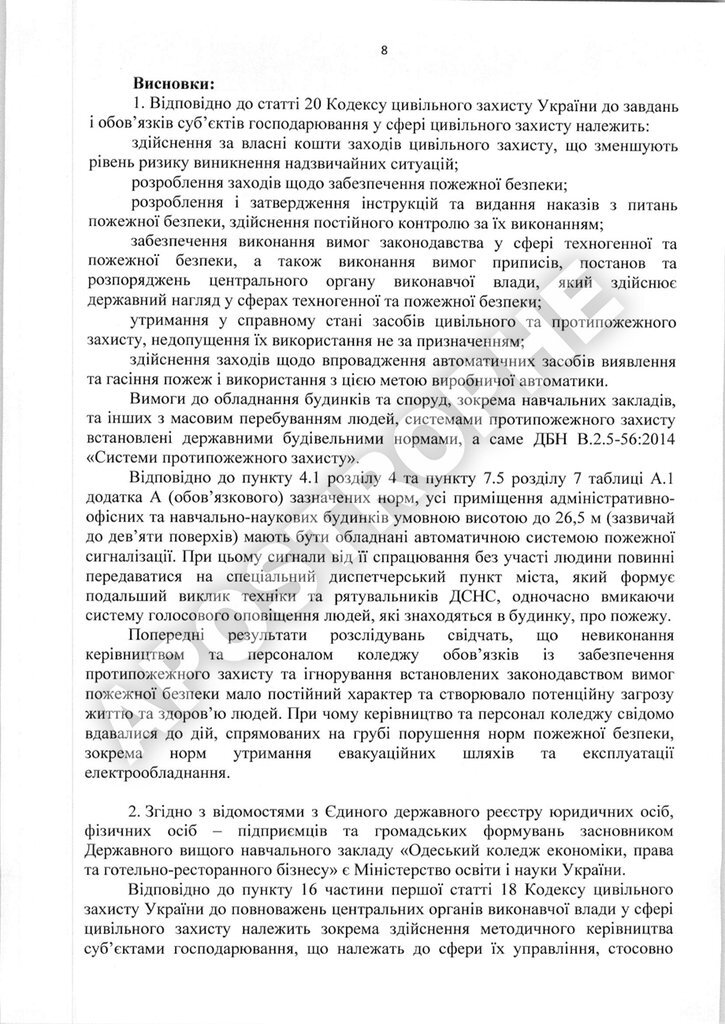 В официальном отчете комиссии Кабинета министров о причинах пожара указаны шокирующие подробности халатности администрации колледжа: в частности: замурованный выход, ручная сигнализация, легковоспламеняющаяся вагонка и полное отсутствие огнетушителей. Отчет комиссии обнародовал Апостроф"
