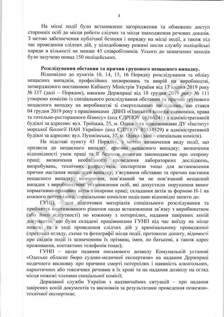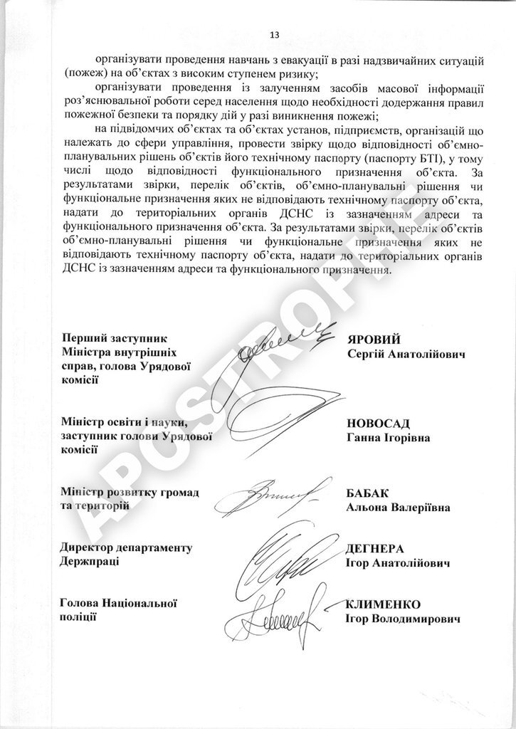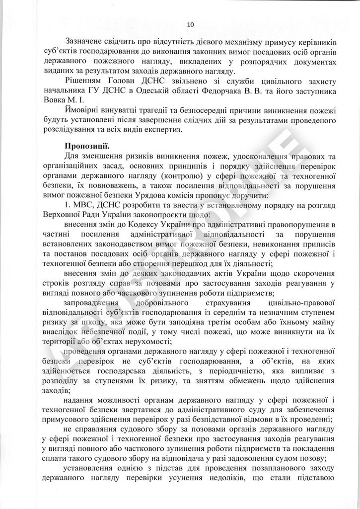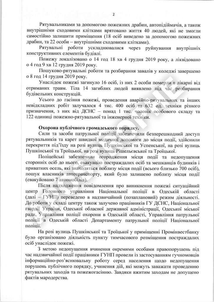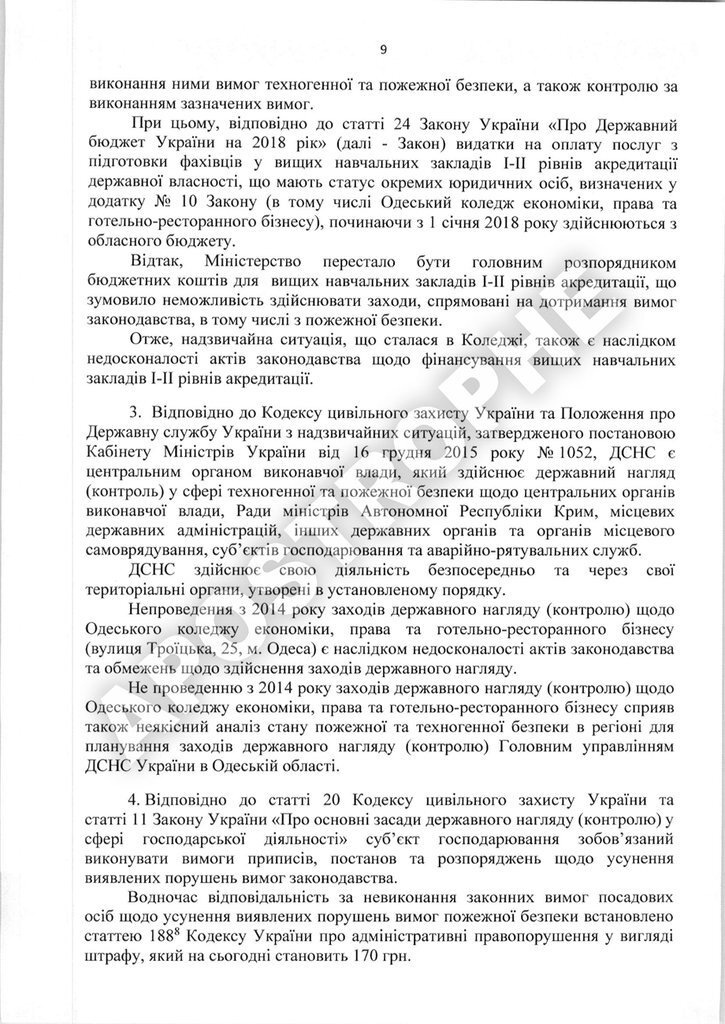 В официальном отчете комиссии Кабинета министров о причинах пожара указаны шокирующие подробности халатности администрации колледжа: в частности: замурованный выход, ручная сигнализация, легковоспламеняющаяся вагонка и полное отсутствие огнетушителей. Отчет комиссии обнародовал Апостроф"
