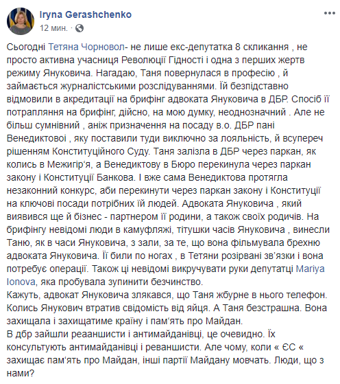 Нардеп Ирина Геращенко поддержала бывшую коллегу.