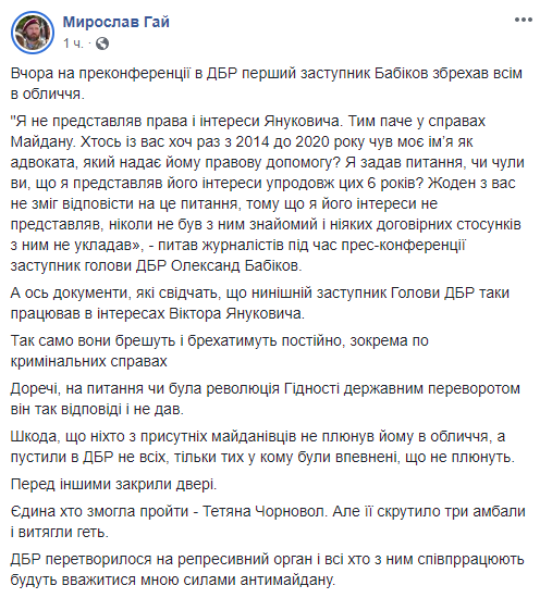 Причиной тому стало проведение пресс-конференции заместителя директора Александра Бабикова, бывшего адвоката президента-беглеца Виктора Януковича.