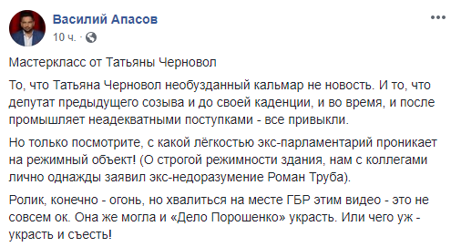 Журналист Василий Апасов не удивлен поступком Черновол, также считая ее неадекватной. Его больше беспокоит легкость, с которой можно попасть на территорию режимного объекта.