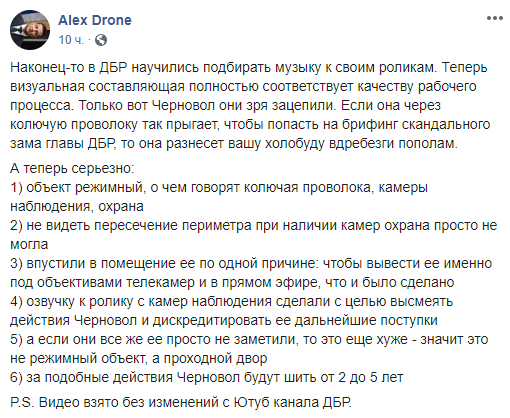 Блогер Алекс Дрон приятно удивлен звуковым сопровождением видеоролика, но также смущен самим фактом проникновения экс-депутата в здание ГБР.