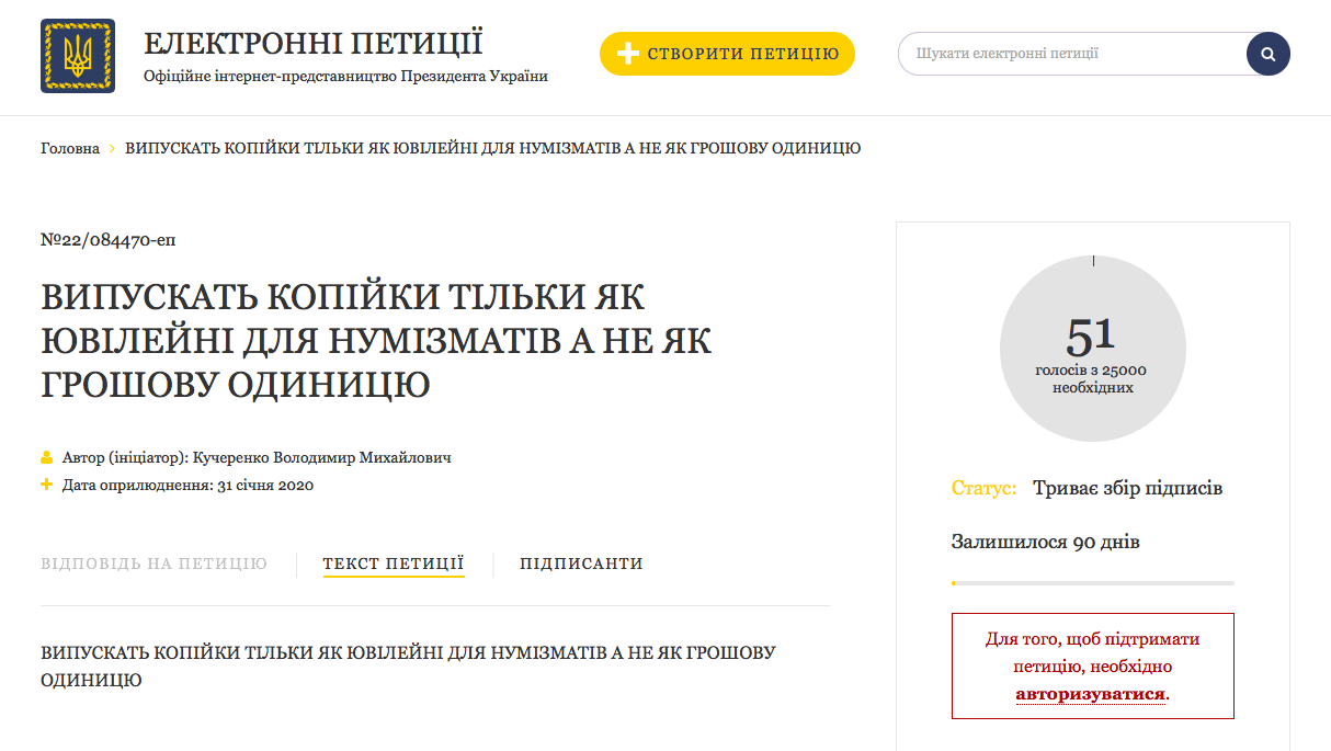 “Выпускать копейки только как юбилейные для нумизматов, а не как денежную единицу”, – гласит текст петиции, которая по состоянию на 2 февраля набрала 51 голос из 25 тысяч необходимых.
