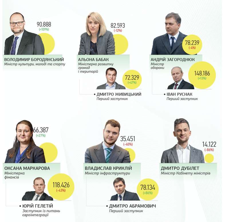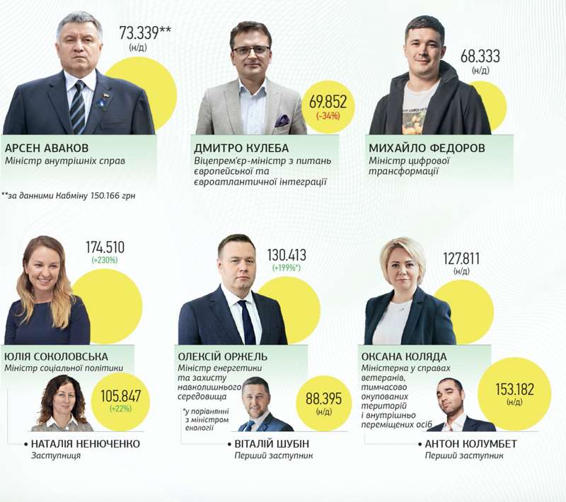 "В декабре 2019 года, министрам и заместителям в правительстве Гончарука начислено от 70 тыс. до 220 тыс. грн, что значительно превышает среднюю зарплату в стране – 10,5 тыс. грн. Доходы нынешней правительственной команды в два-пять раз перекрыли те суммы, которые получали министры и их заместители в Кабмине Владимира Гройсмана", – отмечает издание.