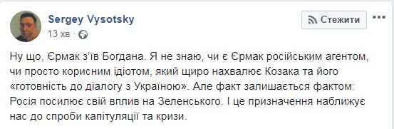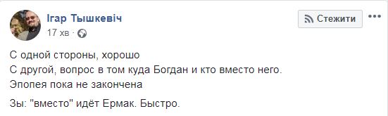 Так, экс-министр инфраструктуры Владимир Омелян пишет об «откровенно российском сценарии»: «Назначение Андрея Ермака на пост главы ОП означает лишь одно — Кремль возвращает свое влияние на Банковую».