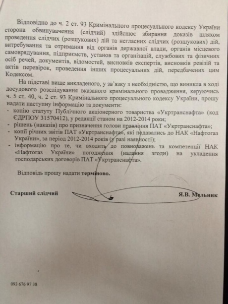 У зв’язку з цим слідчий попросив у "Нафтогазу" надати копію статуту "Укртранснафти" у редакції станом на 2012-2014 роки, рішень про призначення голови правління компанії, річних звітів за цей же період, а також інформації про те, чи вповноважений "Нафтогаз" погоджувати господарські договори "Укртранснафти".