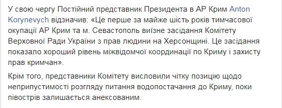 На своей страничке в социальных сетях он также сообщает, что на заседании обсуждали положение дел с соблюдением прав граждан Украины, проживающих на временно оккупированной территории АР Крым и внутренне перемещенных лиц в Херсонской области. Были одобрены рекомендации правительству, СНБО, Министерству по делам ветеранов, Минюсту, Государственной миграционной службе, Министерству инфраструктуры, Минкульту и Минобразования. «В частности, об отмене свободной экономической зоны „Крым“, создании сервисных центров, где будут оказывать все виды услуг, упрощении процедуры установления личности и регистрации фактов рождения и смерти на временно оккупированных территориях», — пишет Юрий Гусев.