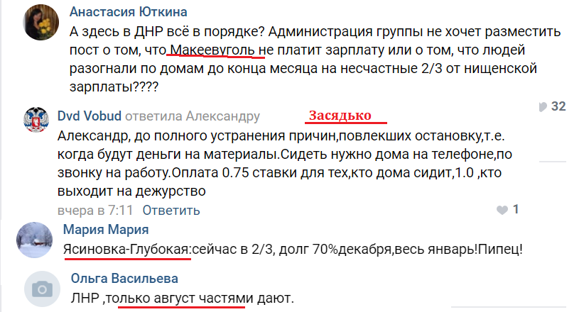 «#Макеевуголь Дали около 39% зарплаты за декабрь и отправили 3,4 смены по домам до звонка. #Макеевпогрузтранс — дулю вам, а не вагоны до оплаты», — отмечают также комментаторы.