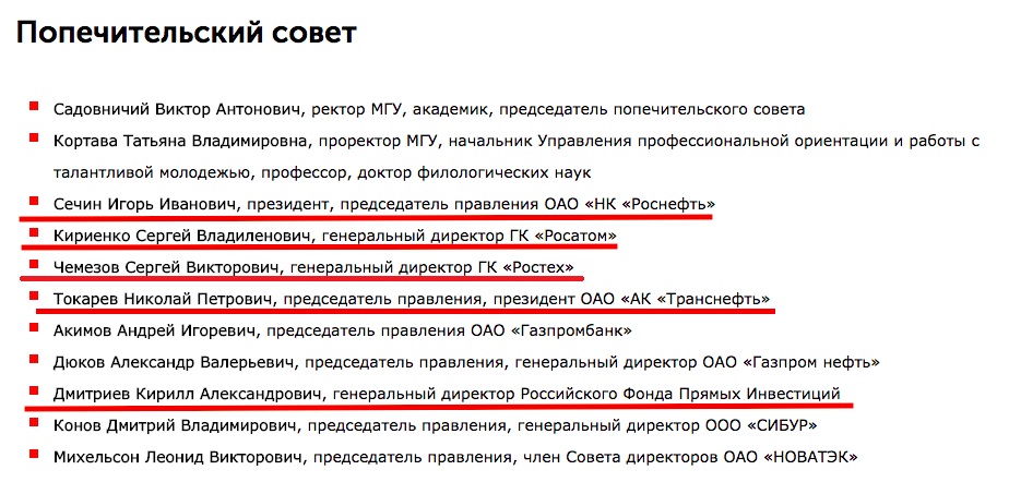 Обратите внимание на подчеркнутые компании. Материальная поддержка этих компаний не ограничивается попечительскими взносами. Фонд "Национальное интеллектуальное развитие" за последние 2 года выиграл у этих компаний конкурсов на почти 100 млн. рублей.