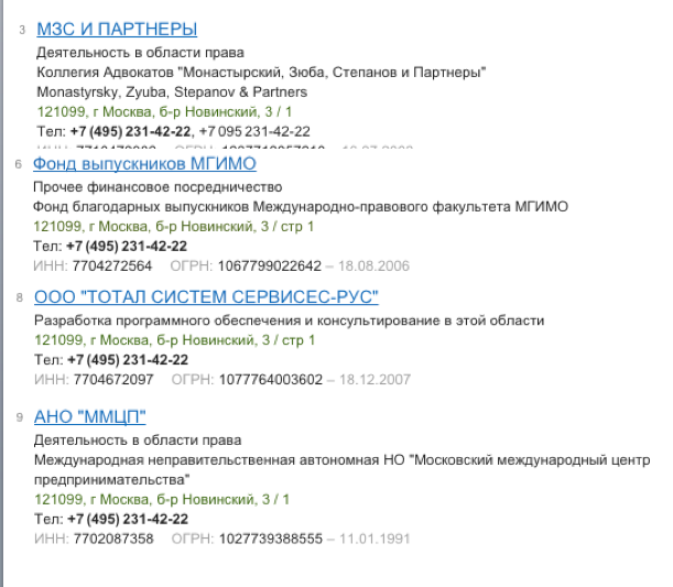 По тому же телефону и адресу, что и Катеринин второй фонд, зарегистрированы несколько юридических контор выходцев из МГИМО и даже фонд выпускников этого университета.
