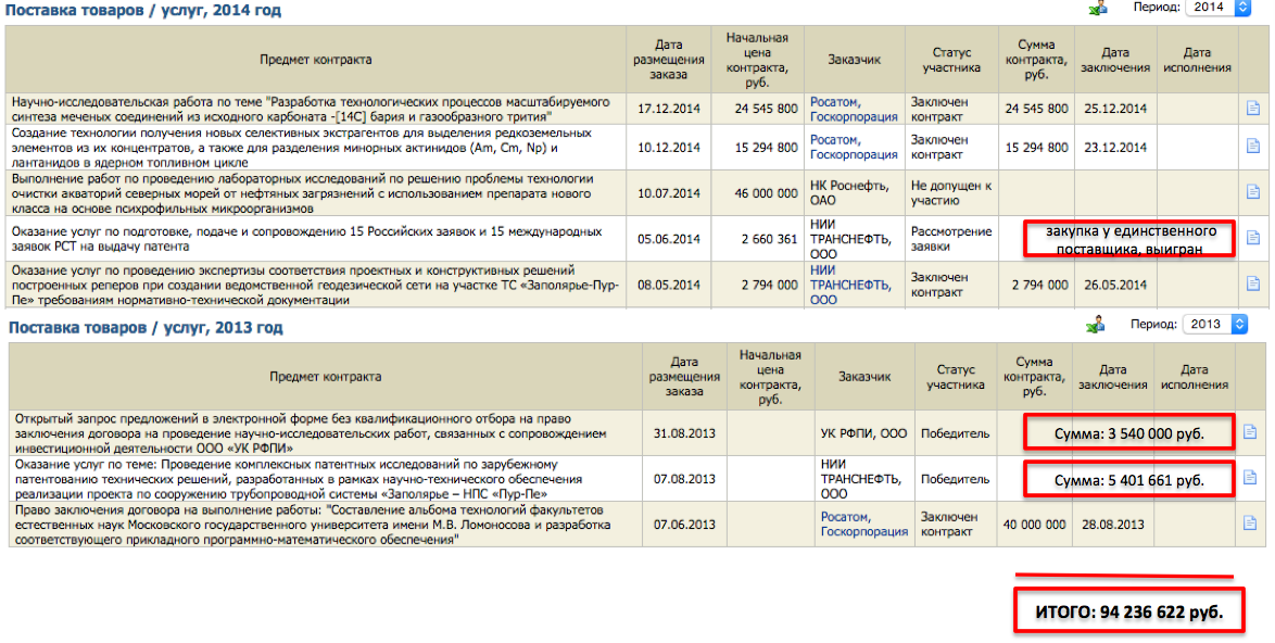 Сомнительным выглядит одна закупка: Росатом заказывает "альбом технологий факультетов естественных наук МГУ" за 40 млн руб. "Альбом" этот должен был представлять собой, цитирую из ТЗ: информационную систему для хранения и обработки данных о научно-технических направлениях и научных коллективах на естественных факультетах МГУ. Оставим без ответа вопрос, на хрена Росатому такой альбом за 40 миллионов. Посмотрим, как фонду Катерины Тихоновой досталась победа.