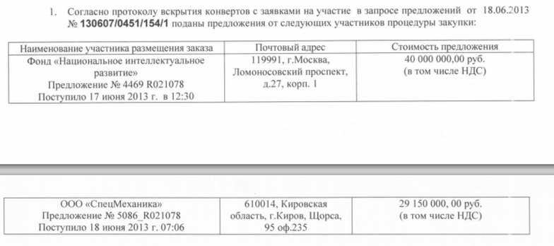 В конкурсе участвовало два претендента: фонд "Национальное интеллектуальное развитие" Катерины с ценником 40 миллионов и ООО "Спецмеханика" из Кирова, предлагающая сделать работу на 10 миллионов меньше.