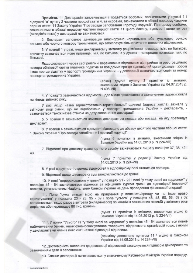 Важным является тот момент, что декларация Порошенко опубликована на сайте главы государства не в том виде, как это предусматривают разъяснения к закону «Об основах противодействия коррупции». Согласно ним, декларация заполняется собственноручно шариковой ручкой или чернилами. Документ о доходах Порошенко за 2014 год заполнен на компьютере и подписан главой государство.
