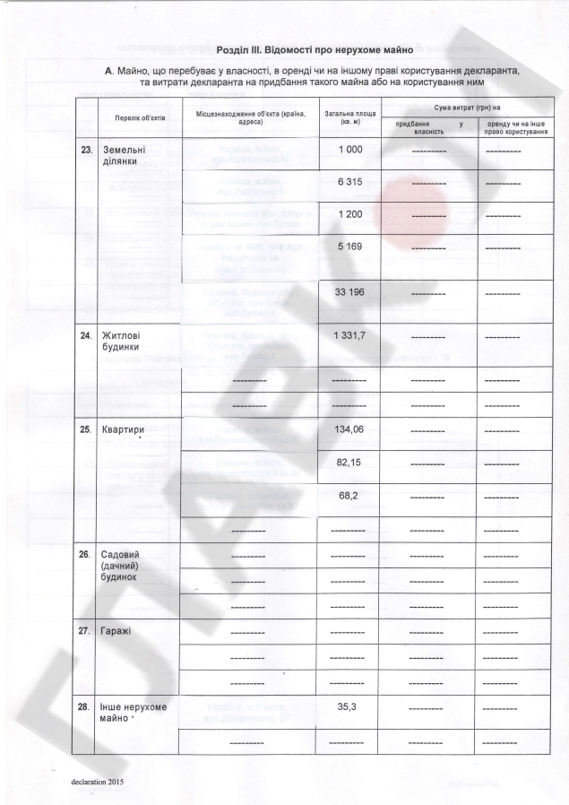 Президент также задекларировал 5 земельных участков общей площадью около 47 тыс. кв. м. А также три квартиры площадью 134,82 и 68 кв. м. Семья Порошенко также владеет землей 2400 кв. м, квартирой 80 кв.м, а также домом 312 кв.м.