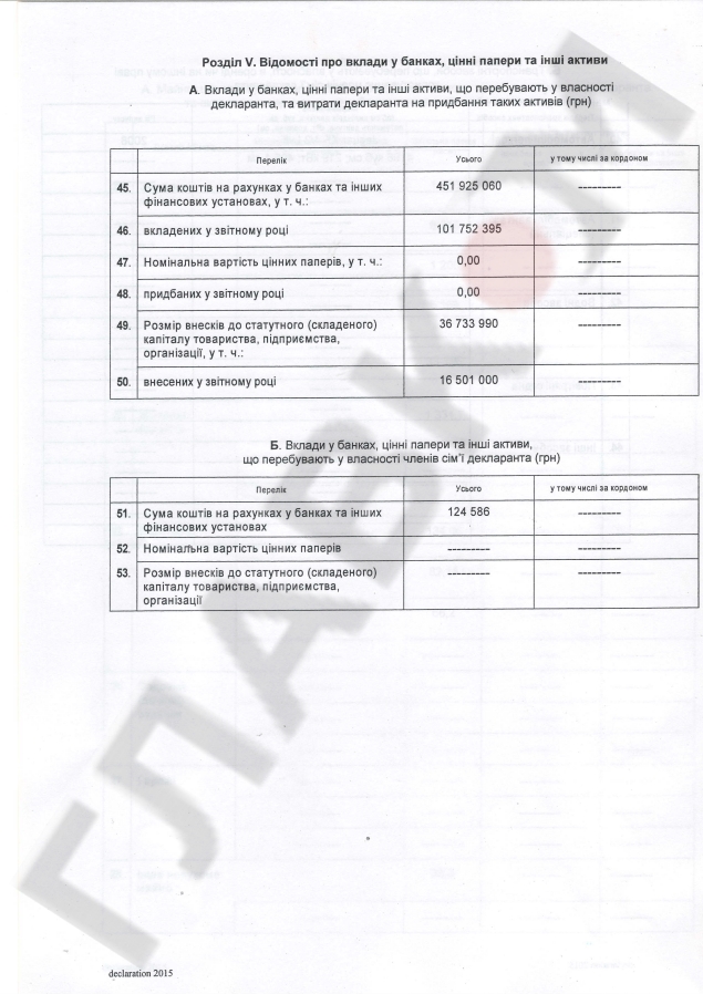 Для сравнения, в 2013 году доходы Петра Порошенко составили 51,83 млн грн, а членов его семьи – 52 тыс. грн. В 2013 году зарплаты, вознаграждения Порошенко составляли 240 тыс. грн, дивиденды, проценты – 13,53 млн грн, доходы от отчуждения ценных бумаг и корпоративных прав – 38,06 млн грн. На счетах в банках у Порошенко в 2013 году было 114 млн грн, у членов его семьи – 105 тыс. грн.