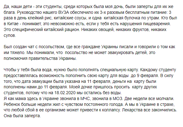 "Но с каждым днем становилось все труднее, количество заболевших росло.Стало проблемно ездить за продуктами. Тяжело описать, как чувствовали себя наши дети. С 9 февраля моя дочь и другие студенты граждане Украины оказались заперты в общежитии университета. Кураторы пошли на это ради блага наших детей. На тот момент вокруг было уже очень много заболевших. Паники не было. Посольство Украины в Китае единственное, наверное, ведомство, которое полностью выполнило свои функции", – поделилась Олефир.