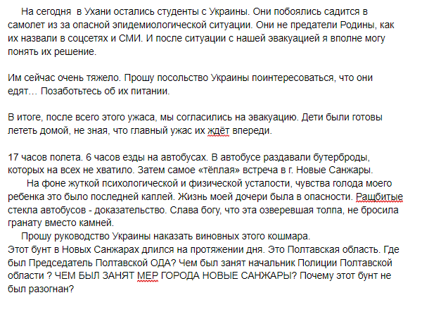 "Когда мы давали согласие на эвакуацию, мы не думали, что придётся пройти через такой кошмар. На момент возникновения эпидемии моя дочь являлась студенткой китайского университета в Ухане. Расскажу пошагово, как развивалась ситуация и через что нам пришлось пройти", - сказано в письме.